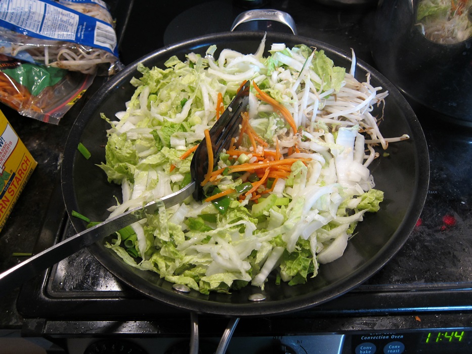 Prepare the pad thai noodles according to the package directions, adding the bouillon to the water. The package I had said to use a weirdly little amount of water, which had boiled off before the noodles were done, so I added 2 or 3 cups extra water. When the noodles are done, drain them and keep the bouillon-y water.