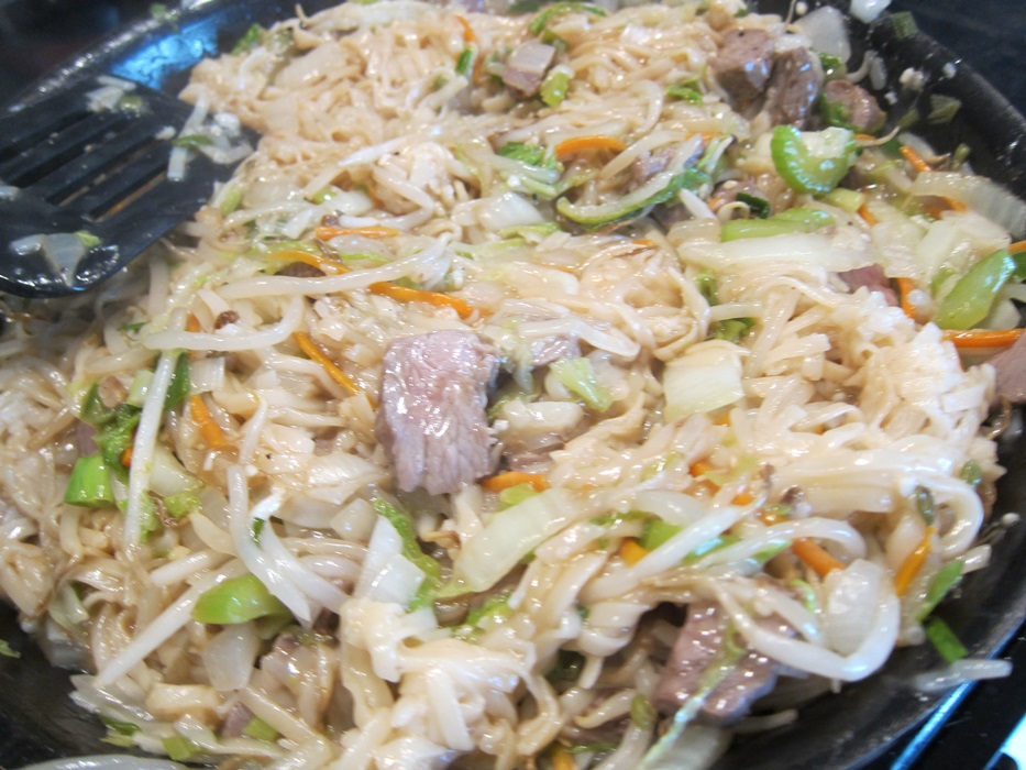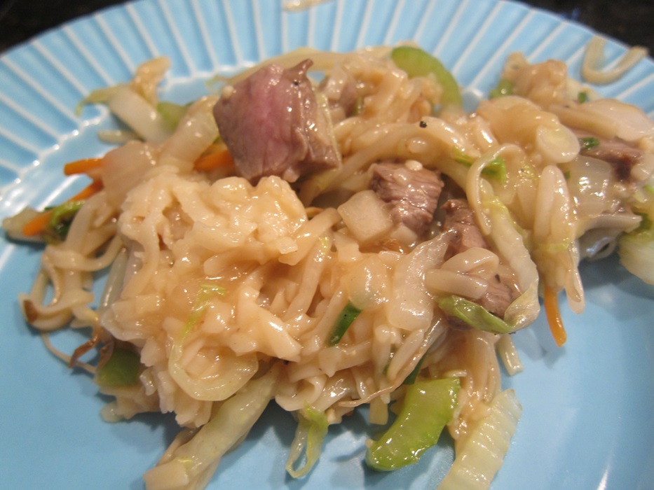 Add the beef, noodles, and soy sauce and cook several minutes more, stirring to ensure the noodles are well covered in sauce.