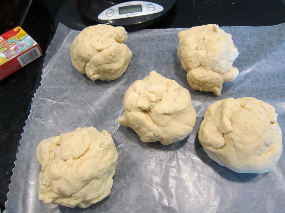IMG_7863Divide the dough into 5 equal pieces. I had my kitchen scale around, so for once my “even” divisions actually were. Put the pieces in bowls or on a piece of wax paper, and cover with saran wrap.