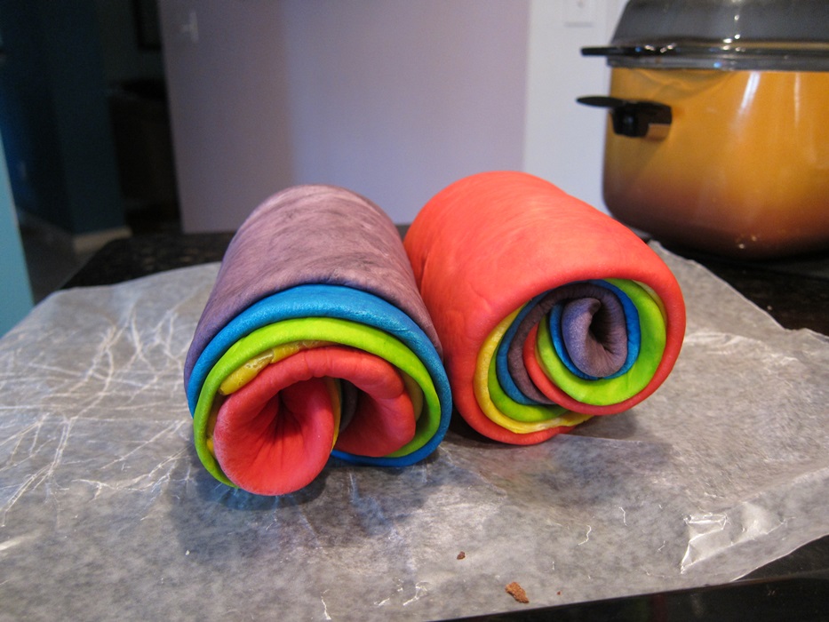 After the dough has risen, punch each color down and roll them out into 8X4″ rectangles. Stack them in a rainbow-y order.