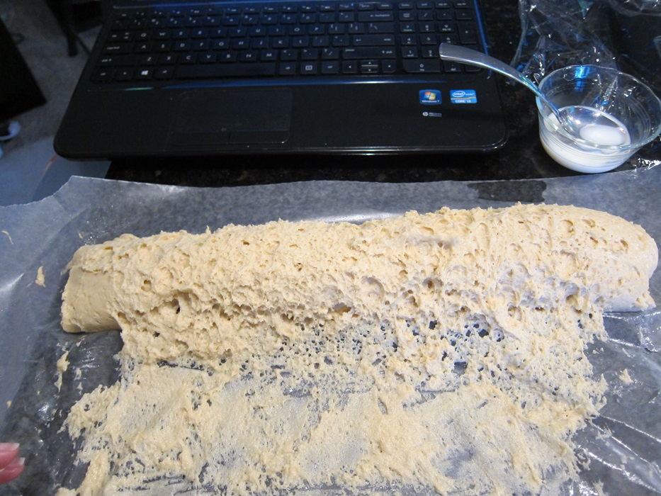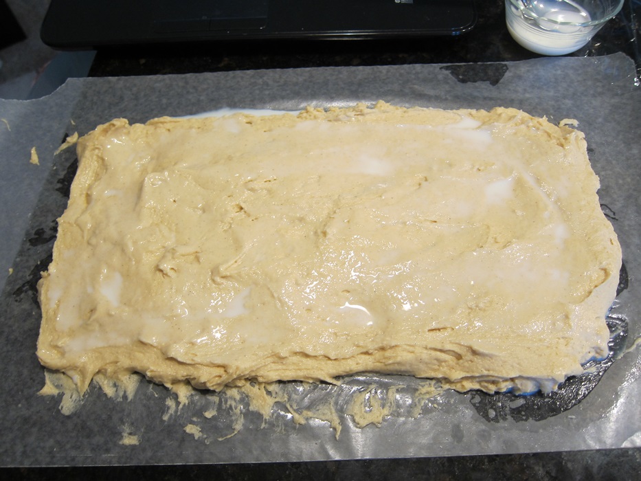 Once the dough is puffy, scoop it out onto some lightly greased waxed paper or parchment paper, and spread it out to an 8X16″ rectangle. I found it easiest to spread using a spatula sprayed with cooking spray. Brush the top with milk.