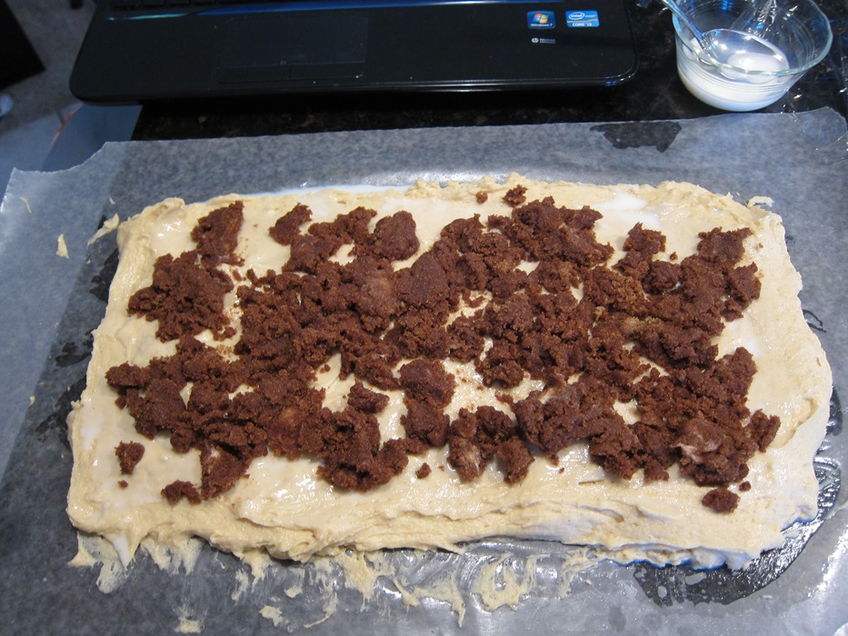 Once the dough is puffy, scoop it out onto some lightly greased waxed paper or parchment paper, and spread it out to an 8X16″ rectangle. Brush the top with milk. Spread the filling over the dough, leaving a border clear around the edges.