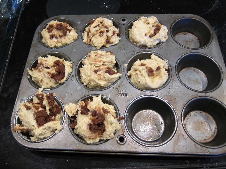 With one of the long sides towards you, lift the edge of the waxed paper, folding the edge closest to you over and starting the roll. Because it’s a soft gluten-free dough, you may have to sort of help the dough off the paper. Keep lifting the waxed paper and helping the dough off it and into a roll. Using a sharp serrated knife, slice the roll into 8 pieces. Grease a cupcake tin and transfer the rolls into it.