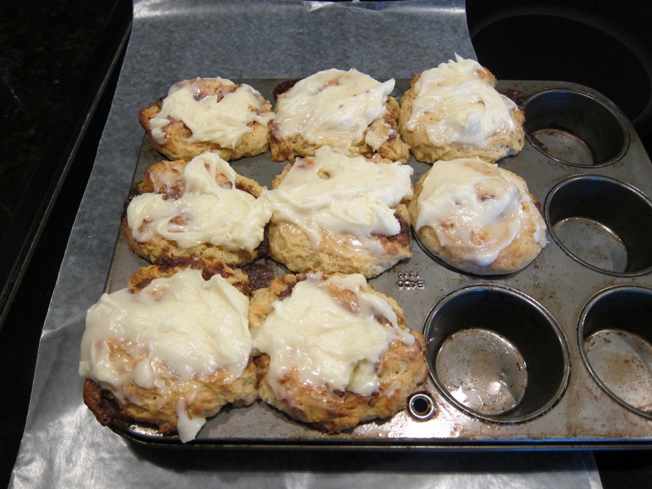 As soon as rolls come out of the oven, spread the icing on them, and serve.