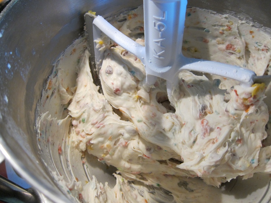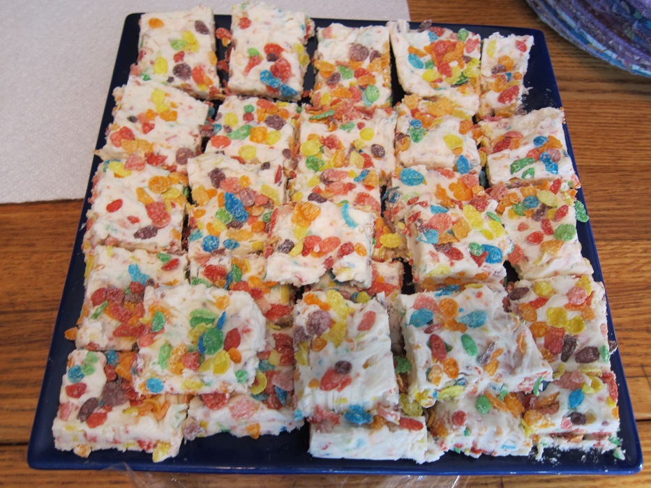 This was another cheery rainbow-y thing I made for my going away brunch. I’d never had Fruity Pebbles before, and they did not disappoint! This would be a good white chocolate fudge without the cereal, but is more fun with it.