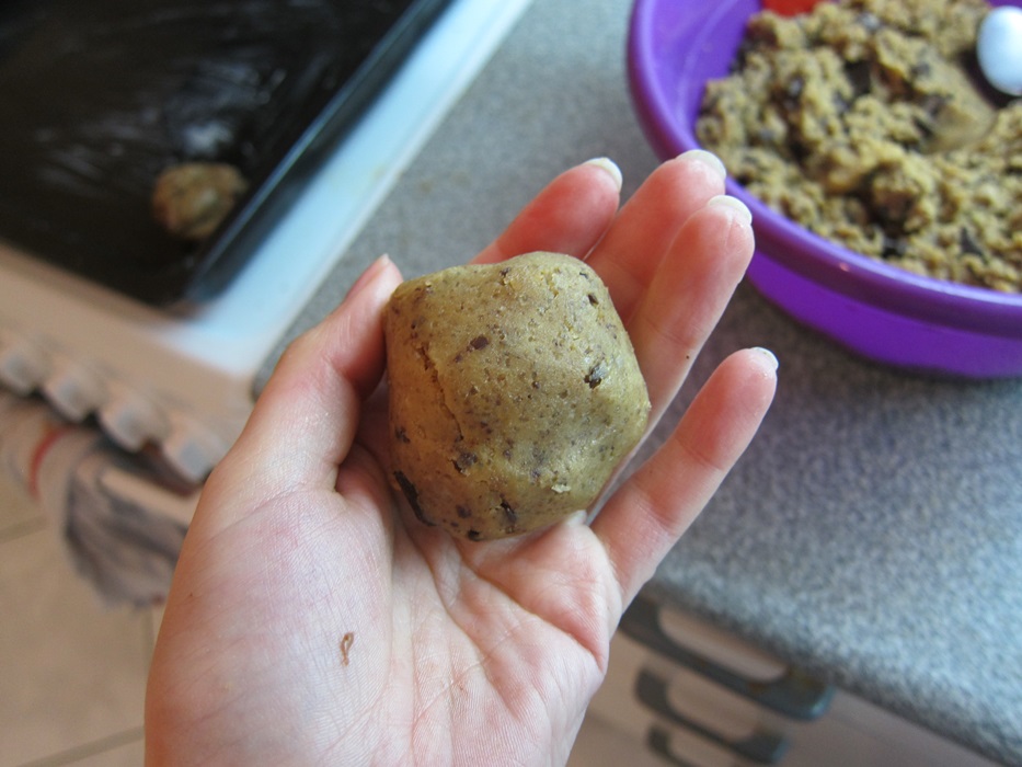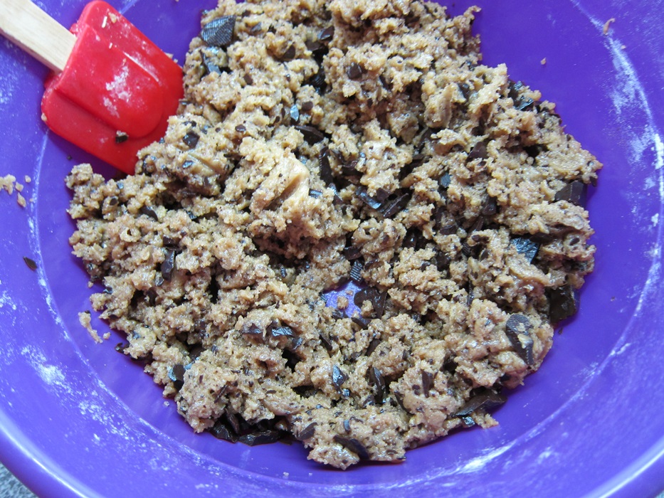 I haven’t found chocolate chips yet, never mind multiple kinds of chocolate chips, so I just bought some bars and cut them up. Once I got home and googled, I realized the chocolate I’d gotten was meant for melting/coating, but… whatever, it tastes good. Chips would definitely be easier in this recipe, as any larger chunks I left uncut were a pain when shaping the dough later.