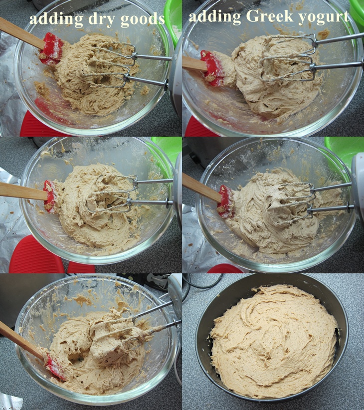 Add the flour mixture in 3 additions, alternating with the Greek yogurt in 2 additions. Transfer to the greased pan.