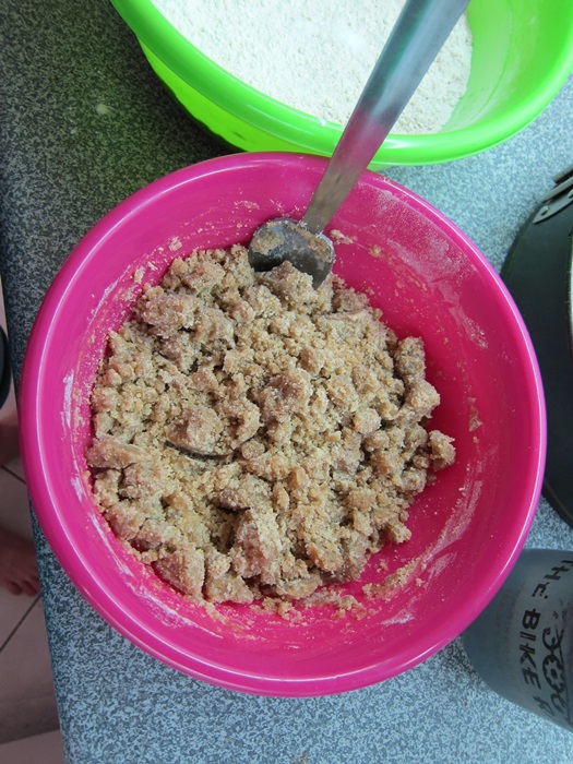 To prepare the crumb topping, first melt the butter. While it melts, stir together the remaining crumb ingredients, then pour the melted butter over the dry ingredients and stir together until well combined. Place in the refrigerator.