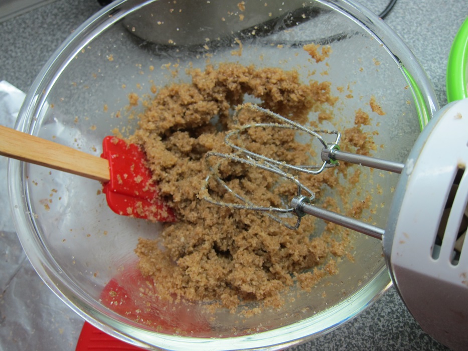 Scrape the chilled brown butter into a large bowl and add the sugar and brown sugar. Beat together until light and fluffy.