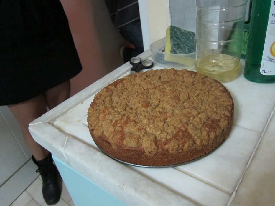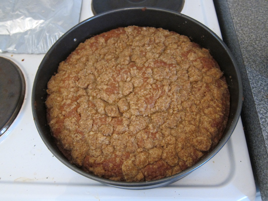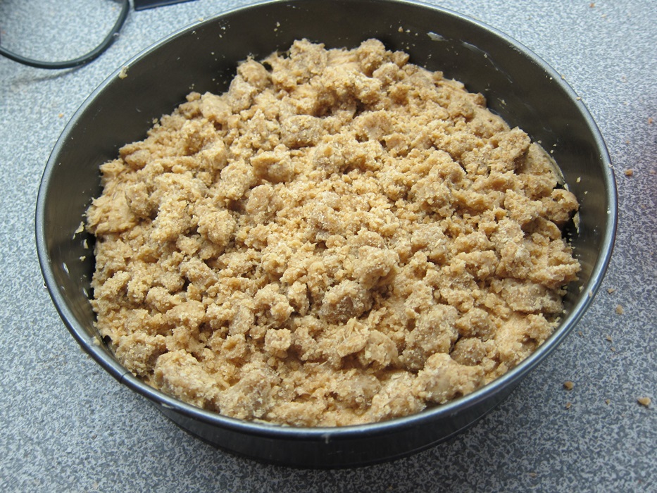 Sprinkle the crumbs over the batter. If bits of your crumb topping have broken up too small, you should be able to squeeze them back into larger chunks, like playdough. 1/2″ chunks are preferable to sort of powder, both for looks and texture.