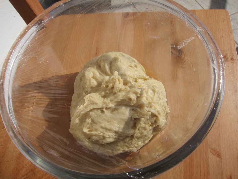 To start the dough, whisk together the egg, milk, water, sugar, butter, and yeast in a medium bowl.