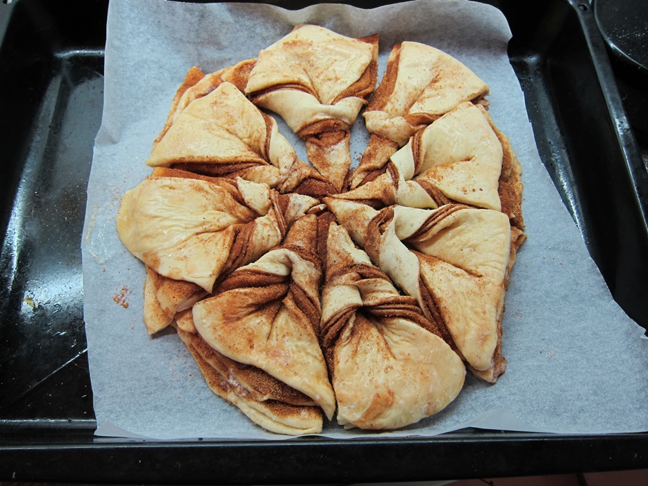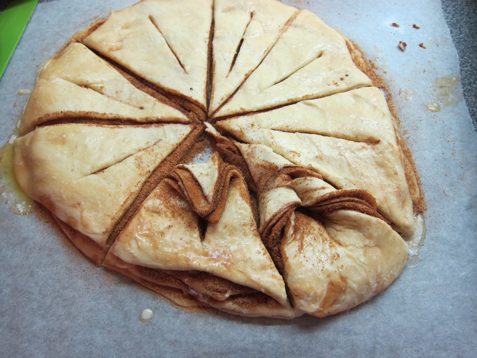 Line a baking sheet and set aside. Stir together the cinnamon and sugar of the filling. Brush 1/4 of the melted butter over one of the rolled out pieces of dough, and sprinkle 1/3 of the cinnamon sugar mixture evenly over the butter. Top with a second piece of dough, and repeat with another 1/4 of the butter and 1/3 of the cinnamon sugar, and again with the third piece of dough. Top with the final piece of dough, and brush with the remaining butter.