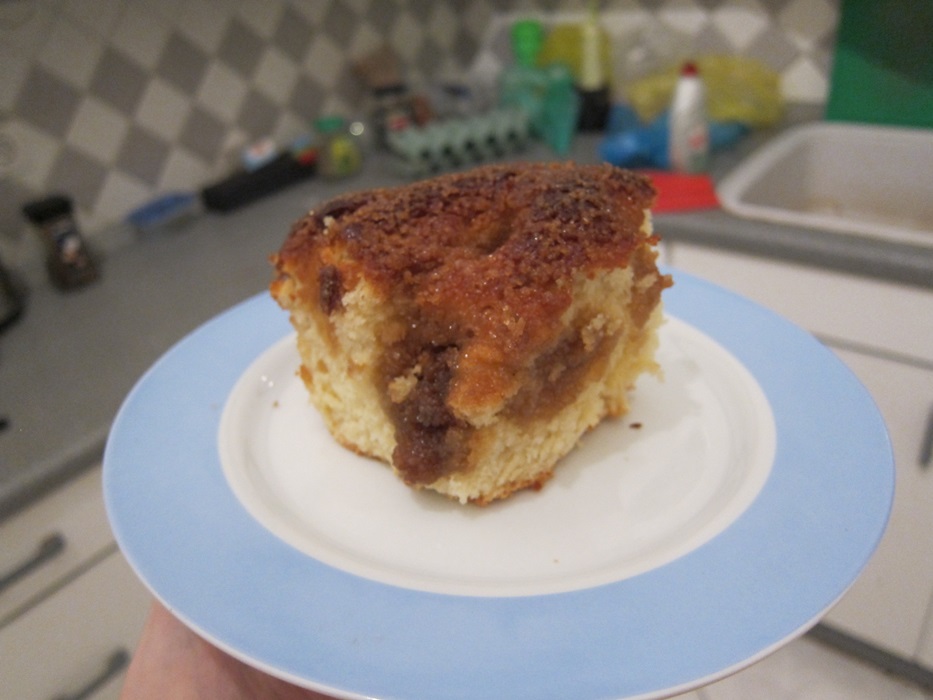 The cake turns out fluffy, big, and nice. Oh, the person that gave me the recipe suggested doubling the topping, for extra deliciousness. I didn’t have enough brown sugar to do it, which in retrospect turned out to be a very good thing, since mine already overflowed without twice as much, but if you’re not alarmed by that much butter (it’s over a huge amount of baked good, it’s fine, you’ll share, really you will this time), go for it!