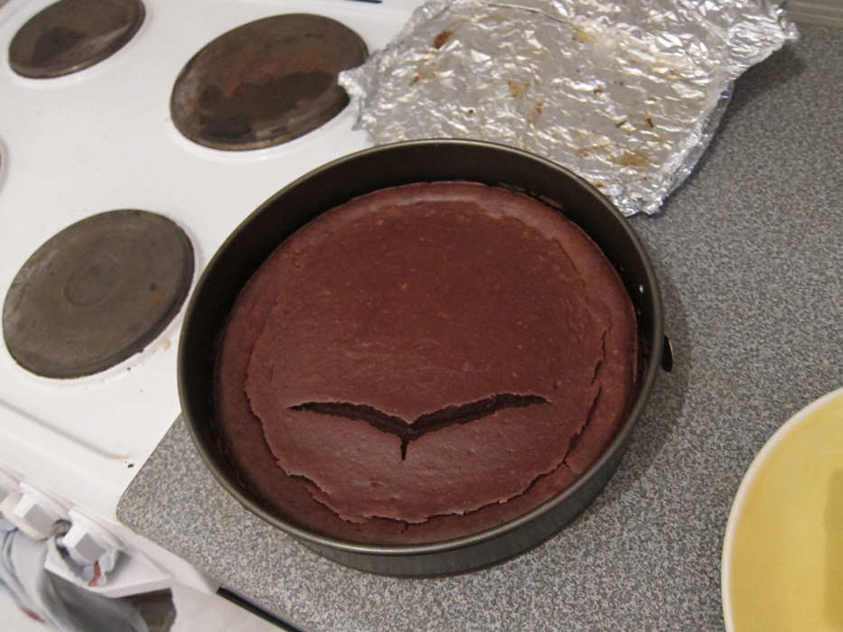 Bake 45-50 minutes, until a toothpick inserted 1″ from the edge comes out clean. (I didn’t actually check this.) It’s fine if the center doesn’t look set yet. Leave the cake in the oven, with the heat off and the door cracked open several inches, and let cool for 1 hour. Remove from the oven and let cool on a rack until room temperature (several tortuously slow hours), then transfer to the fridge to chill through.