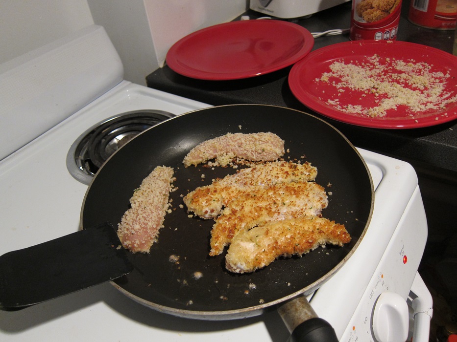While the dough rises, you can prepare the chicken. Lightly beat the eggs together in a small bowl, and pour some of the bread crumbs into a plate. Heat a bit of olive oil in a pan on the stove. Dip the pieces of chicken into the eggs, then cover thoroughly with the bread crumbs, then lay each in the pan, only covering as many at a time as fit in the pan. Cook until the bread crumbs are golden, then flip. Cook until the other side is done as well, then remove to a plate and cook the rest of the chicken.