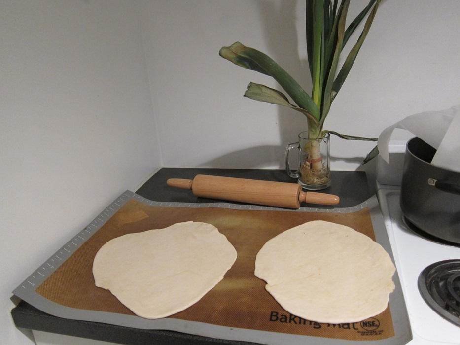 When the dough has finished rising, preheat your oven to 375 degrees and line a baking sheet with parchment. Divide the dough into 2 equal portions, and roll each out into a circle.