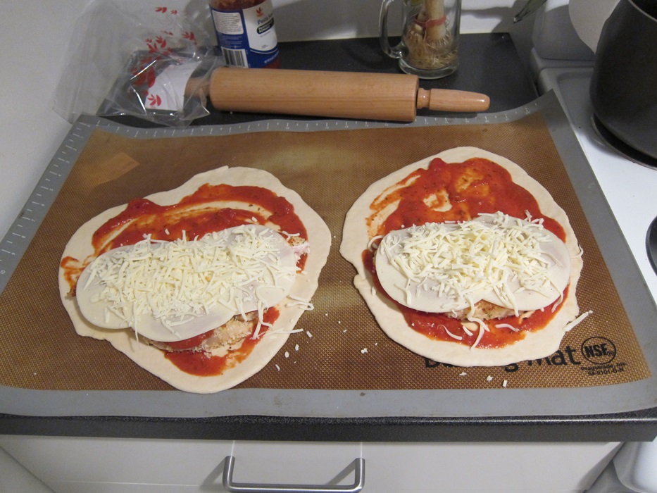 Spread about 1/4 cup of the pasta sauce on each of the dough circles, leaving a 1/2″ clear around the edges. Place three pieces of cooked chicken on each of the pieces of dough, on one side, then spread the remaining sauce on the chicken.