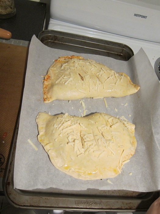 Fold the dough over, and press the edges firmly to seal. Transfer carefully to the baking sheet. Brush some of the remaining egg over the top of each, and sprinkle parmesan cheese on top. Cut small air vents in the top of each calzone. Bake 30 minutes until browned.