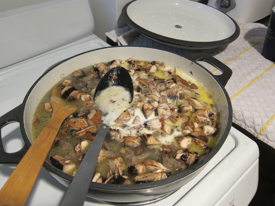 Add the cream, stock, and water and bring to a simmer.