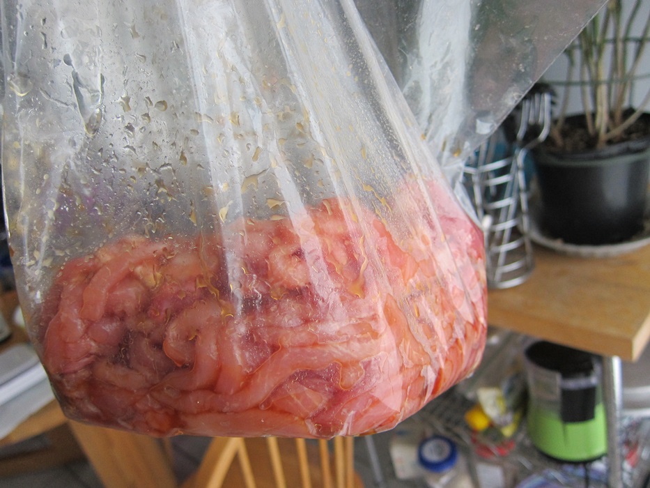 Cut the pork into 4 chunks and freeze 20-30 minutes, so that it firms up. Cut into 1/4″ thick slices, then stack and cut into thin slices. Combine the sliced pork with two tablespoons of the soy sauce, the sake, and the cornstarch. Set aside to marinade while you prepare the other ingredients.
