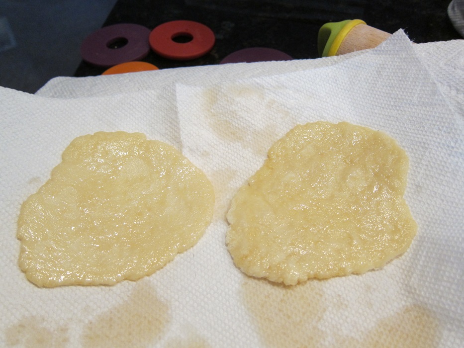 Once on the fresh lined plate, pull the two pancakes apart, and cover them with a fold of towel/piece of paper towel.