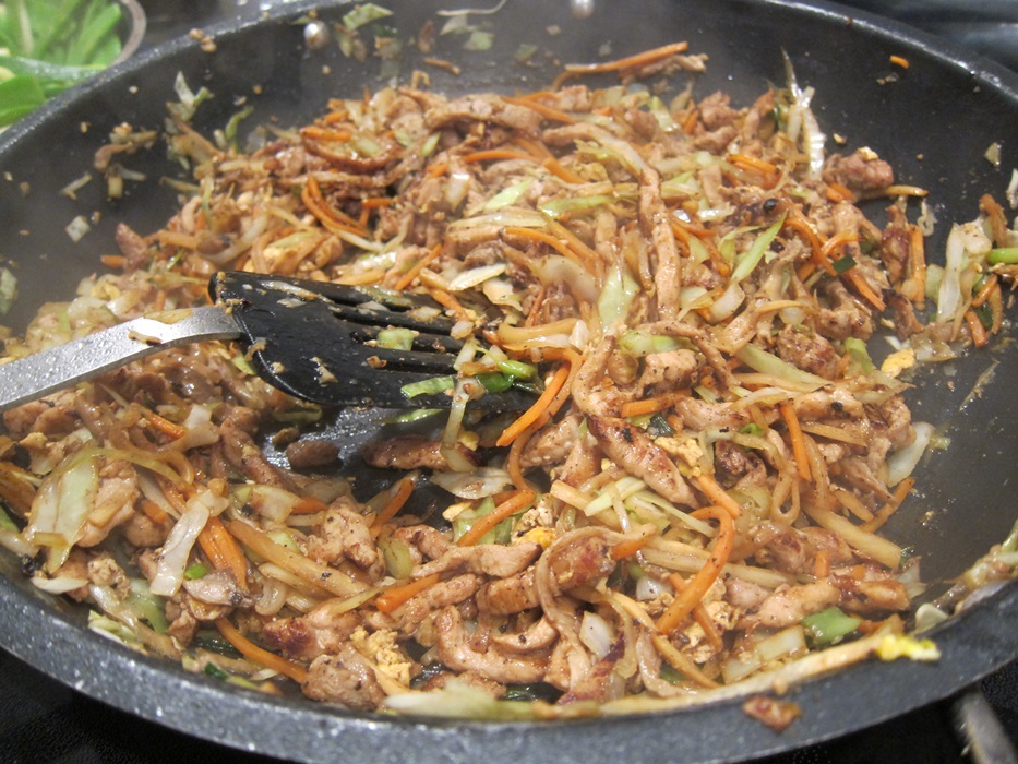 Heat the remaining tablespoon of oil and cook the garlic and green onions for 30 seconds. Add the wood ear, cabbage, carrots, and bamboo, and cook until the cabbage starts to wilt, about 3 minutes. Add back the pork and eggs, and stir in the remaining tablespoon of soy sauce and the salt. Cook until heated through.