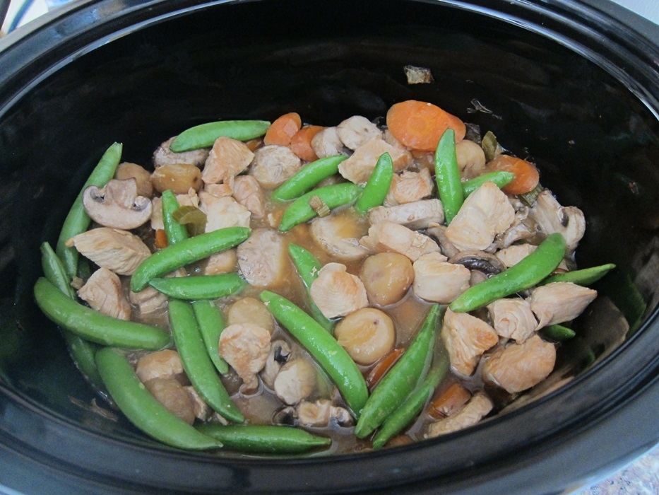 In a small bowl or cup, stir together the cornstarch and water until no clumps remain. Stir into the crock pot mixture, then add the mushrooms and pea pods. Turn the heat to high, recover, and cook an additional 15 minutes.
