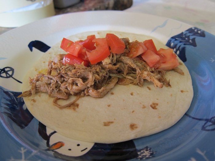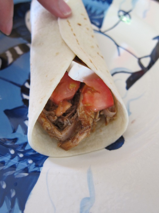 Put about 1/2 cup of the pork on each tortilla and top with tomatoes, cilantro, and (my addition) brie. Wrap up, and eat!