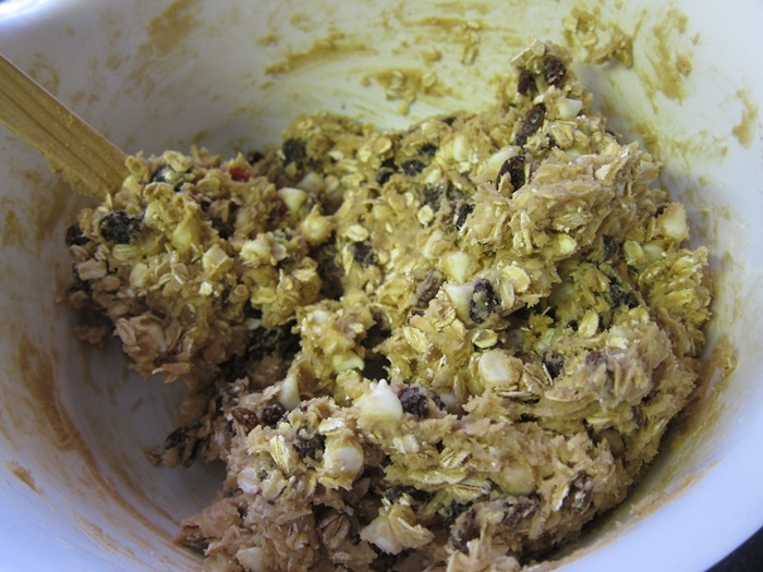 Beat in the flour mixture until just combined. Stir in the oats, raisins, and white chocolate chips by hand.