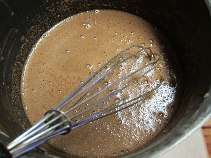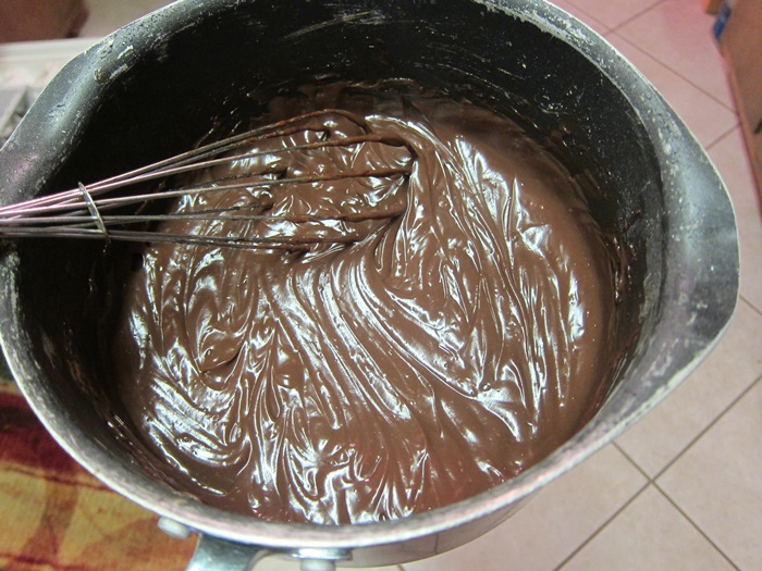 Remove from the heat and add the chocolate, stirring until the chocolate has melted and the mixture is smooth.