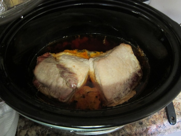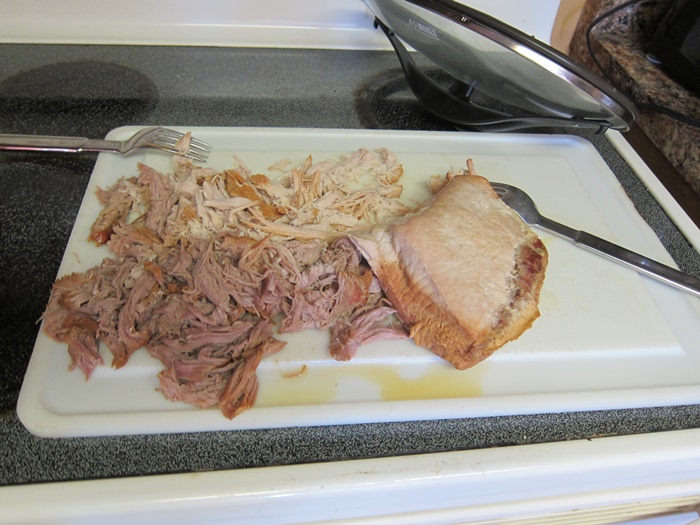 Remove from the crock pot and shred using two forks, then return the shredded meat to the liquid in the crock.