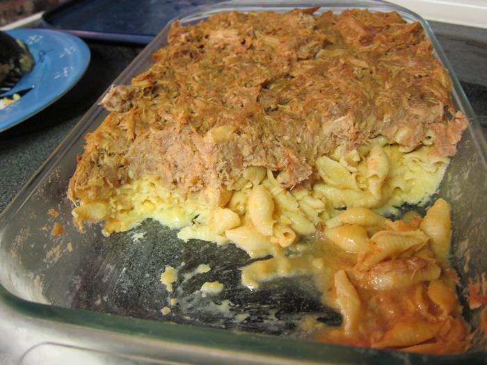 Transfer the macaroni and cheese to the greased dish and spread evenly. Top with the pulled pork. Top with extra cheese, if desired, then bake 15 minutes.