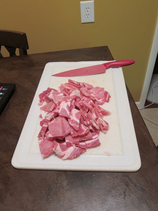 To prepare the pork: Slice the pork into 1/8″ thick slices (easier if the pork is firm from being slightly frozen), then cut those slices into roughly 2″ x 2″ pieces. Place in a large ziploc bag.