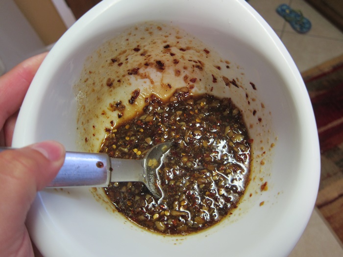 IMG_6350Transfer to a medium bowl, then add the green onions, soy sauce, sugar, black pepper, sesame oil, and gochuchang and stir well.