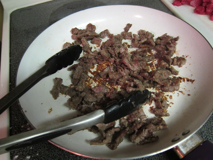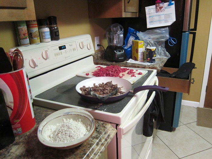 Season the beef with the salt, pepper, and thyme. Dredge in the flour, shaking off excess. You want lightly coated, the goal isn’t deep fried battered beef!
