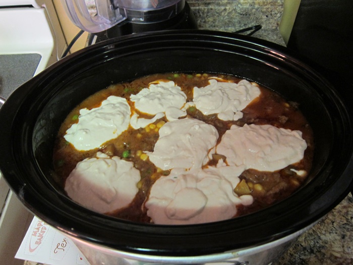 Stir together the Bisquick and milk until no lumps remain. Place in large dollops over the surface of the mixture, then put the lid back on.