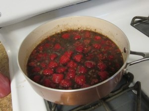Add the balsamic vinegar and cook until reduced, scraping the brown bits off the bottom of the pan (if you’re not using non-stick anyway). Add the stock and raspberries, and cook until the berries are soft and warm.
