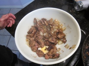 Once all the livers are cooked, add the egg and a pinch of salt.
