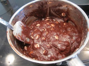 Remove from the heat and stir in the eggs, sugars, and vanilla, stirring again until smooth.