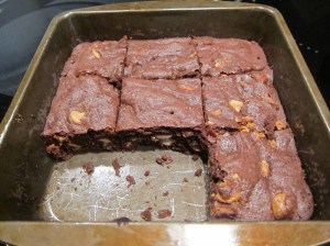 Tasty brownies that go well with ice cream, especially banana ice cream! They’re quite chocolate-y, sturdy without being a weird gf-y texture, and benefit from the cup of caramel chips I threw in!