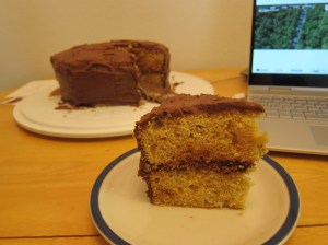 I put the sugar in a yellow cake and paired my hopefully-caramel cake with chocolate cream cheese frosting. Couple hours of making/baking/cooling later, and I had…a cake that’s entirely fine but in no way caramel. Disappointing.