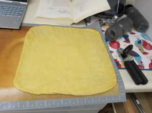 Once risen, punch down and turn back out onto lightly floured surface. Pat out to a 14″ square, then let it rest 3-4 minutes while you drain the olives.