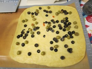 Place the kneaded dough into a greased bowl and let rise until doubled, about 90 minutes. Once risen, punch down and turn back out onto lightly floured surface. Pat out to a 14″ square, then let it rest 3-4 minutes while you drain the olives.