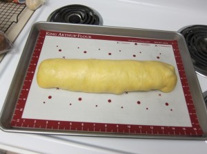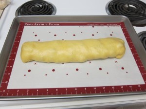 Roll up the dough from one side, like a jelly roll, then place seam-side-down on a greased or lined baking sheet.