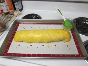 Spread the olives over the dough square, pressing them lightly into the dough. Roll up the dough from one side, like a jelly roll, then place seam-side-down on a greased or lined baking sheet. Tuck the ends over underneath the roll, then press the whole thing down gently to shape into an oval about 2″ thick. Cover with waxed paper or saran wrap and set aside to rise until puffy, about 30 minutes. Meanwhile, preheat the oven to 350 degrees.