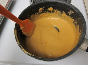 Combine the butterscotch chips and shortening in a large saucepan over low heat. Stir occasionally, and with increasing frequency as they start to melt, until the mixture is smooth.