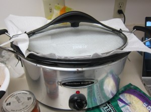 Turn heat on to high, and cook approximately 3 hours – even my double-dough one was cooked through fine at 3, but I don’t think it’ll be ruined if you can’t get it out until 3 1/2.