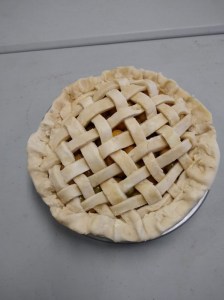 Once the dough is chilled, preheat your oven to 425. Roll out one of the disks of dough and line a pie dish with it. Prick all over with a fork. Roll out the other disk of dough and cut into thin slices. In a medium bowl, stir together the filling ingredients well, then gently spoon into the bottom crust. Create a lattice top with your crust slices, laying strips in one direction, then folding every other one back about halfway to add a perpendicular strip, alternating which strips get folded back to create a woven-looking pattern. Fold over the outside edge and crimp, then bake 20 minutes. Reduce the heat to 300 and bake an additional 35-40 minutes, until the filling is thickened. Serve still warm.