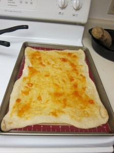 Remove the crust from the oven and spoon several large spoonfuls of apricot preserves on it.