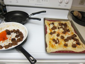 While the crust bakes, cook the chorizo on the stove over medium-high heat.